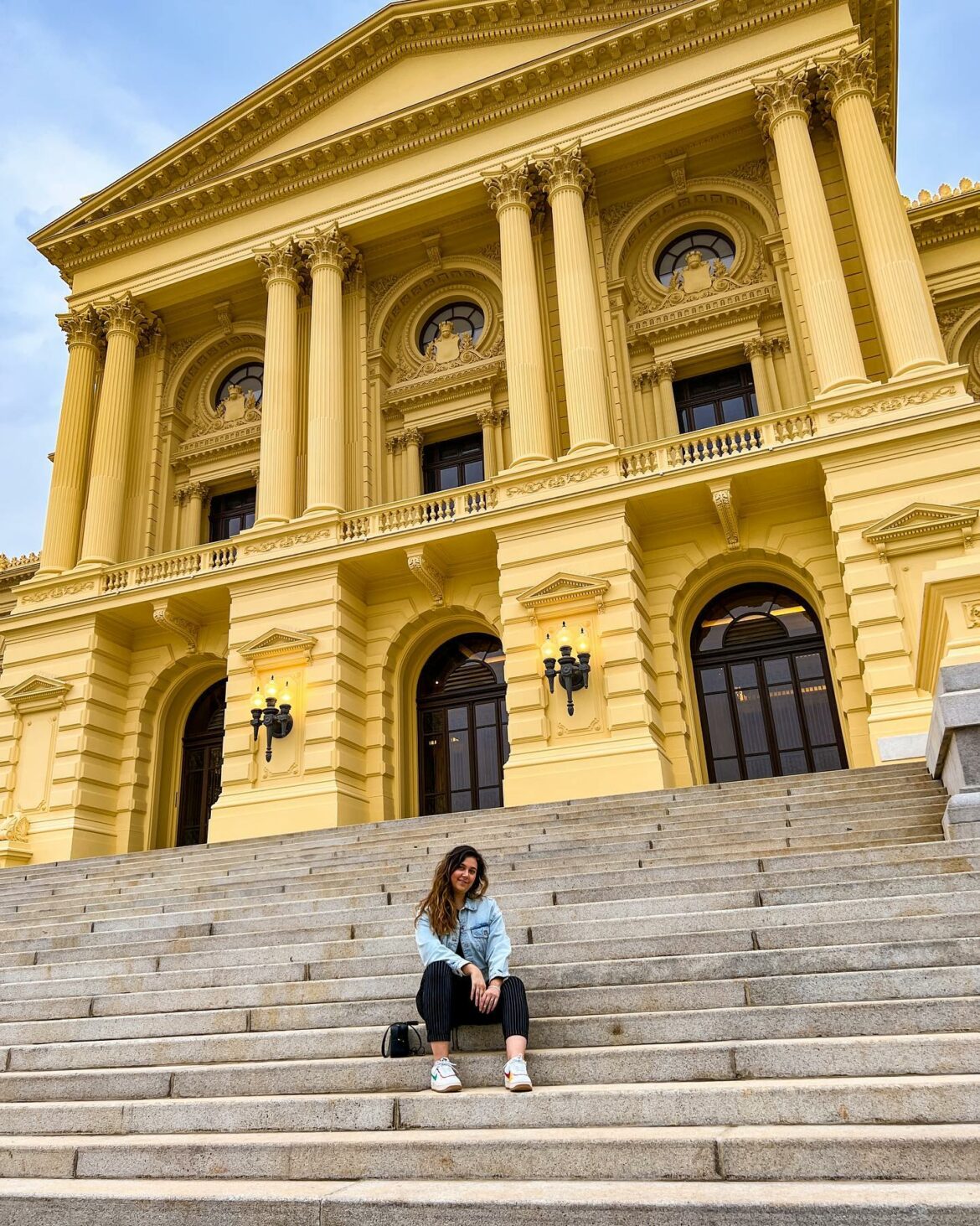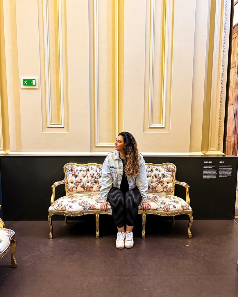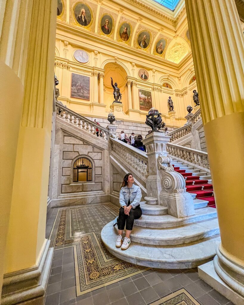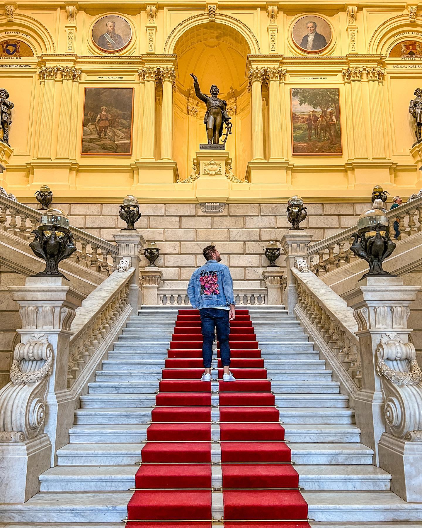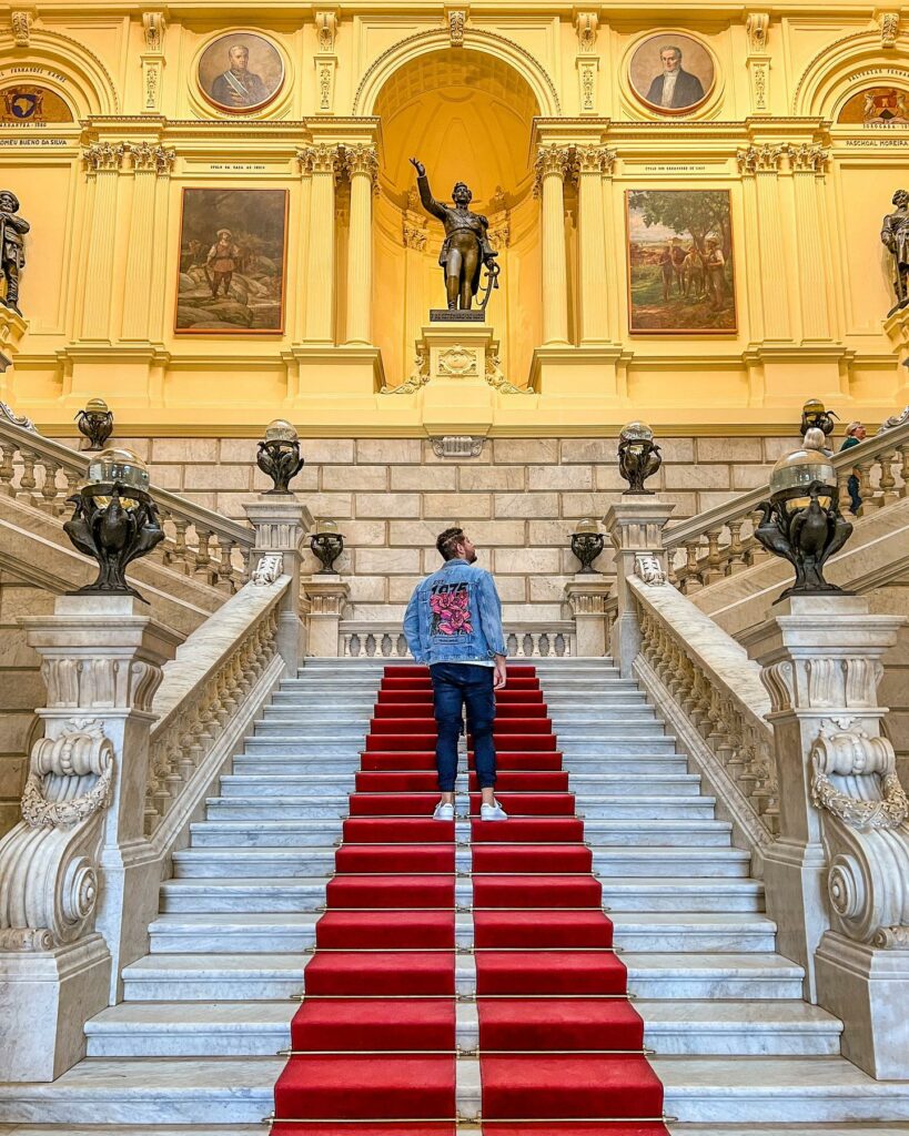 Logo que entramos no museu, tem uma escadaria que com certeza é o “point” pra tirar fotos, ela é bem bonita e cheia de detalhes! 🤩 Mas calma, ao chegarem, já vão conhecer as exposições do térreo e deixem pra tirar foto quando subirem para o primeiro andar, pois todo mundo chega e já se forma fila pra fazerem as poses hahaha… 📸