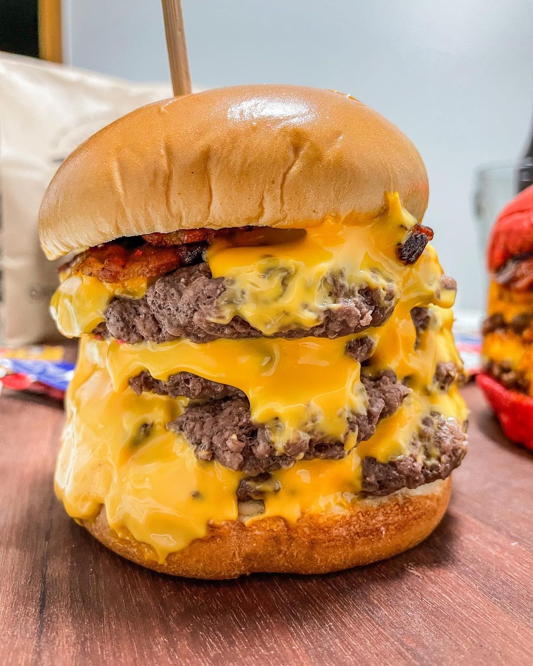 🍔 Rafolas Burgui: 4 smashs de 100g, cheddar melt e bacon no pão brioche (R$ 42)